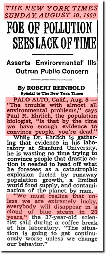 In a 1969 New York Times article, depopulation pusher Dr. Paul Ehrlick claimed that by 1989, “everybody will disappear in a cloud of blue steam” if population growth wasn’t slowed.