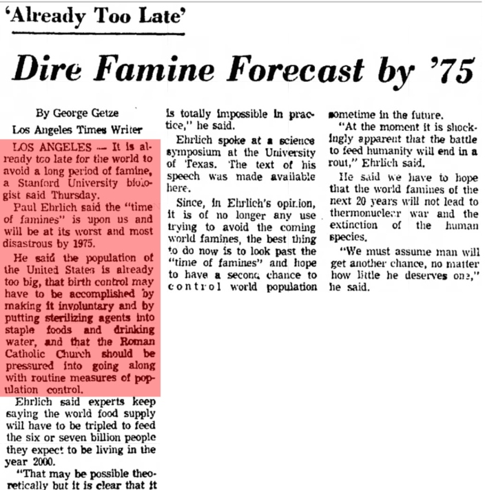 “It is already too late for the world to avoid a long period of famine, a Stanford University biologist said,” the paper noted. “Paul Ehrlich said the ‘time of famines’ is upon us and will be at its worst and most disastrous by 1975.”