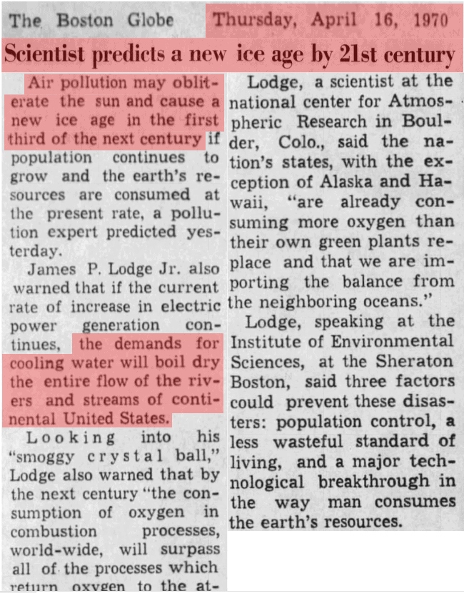 The reasons for the ‘next ice age’ — higher consumption of oxygen than replacement back into the environment — has also not happened. Neither has overpopulation, a climate apocalypse, the total destruction of the ozone, or mass starvation.