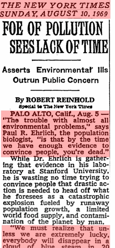 The New York Times added: “While Dr. Ehrlich is gathering that evidence in his laboratory at Stanford University, he is wasting no time trying to convince people that drastic action is needed to head off what he foresees as a catastrophic explosion fueled by runaway population growth, a limited world food supply, and contamination of the planet by man.”