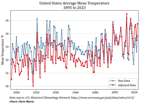 The United States Historical Climatology Record provides raw data on the mean temperature in the U.S. from 1895 to 2023. Over the past 128 years, the average temperature reading has fluctuated up and down slightly, but there haven’t been any significant warming trends over that time, and the fluctuations have not been extreme at all. The […]